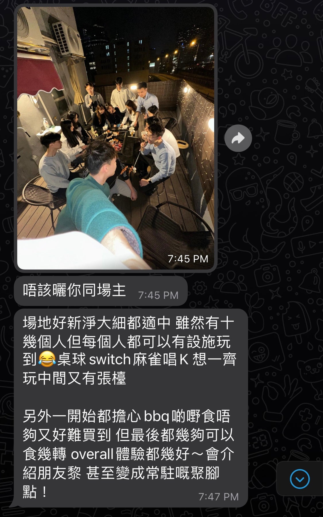 - 節日求婚或紀念日驚喜:天台燒烤場的浪漫夜景,簡單加上燈串佈置與氣球,就能瞬間變身浪漫告白現場。在好友的見證下,這種既私密又熱鬧的場地,往往比酒店餐廳更具溫馨感。