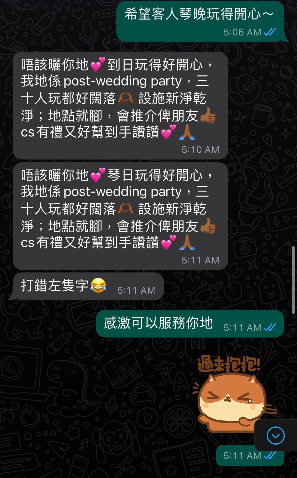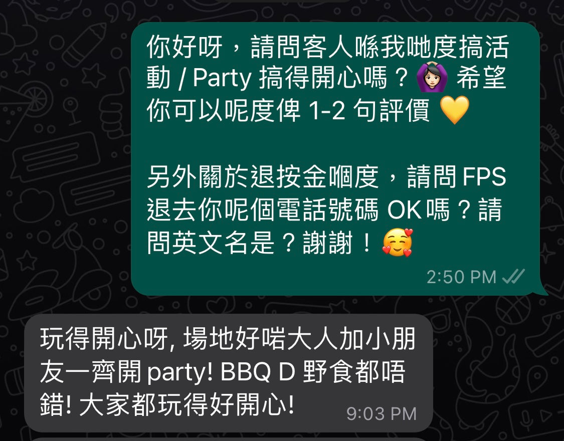 每位客人預約確保包場,提供高私隱度活動空間每一個時段我們只接受一個預約,確保客人可以舉辦一個開心派對活動。室內室外私人獨立包場,無需同人 Share。