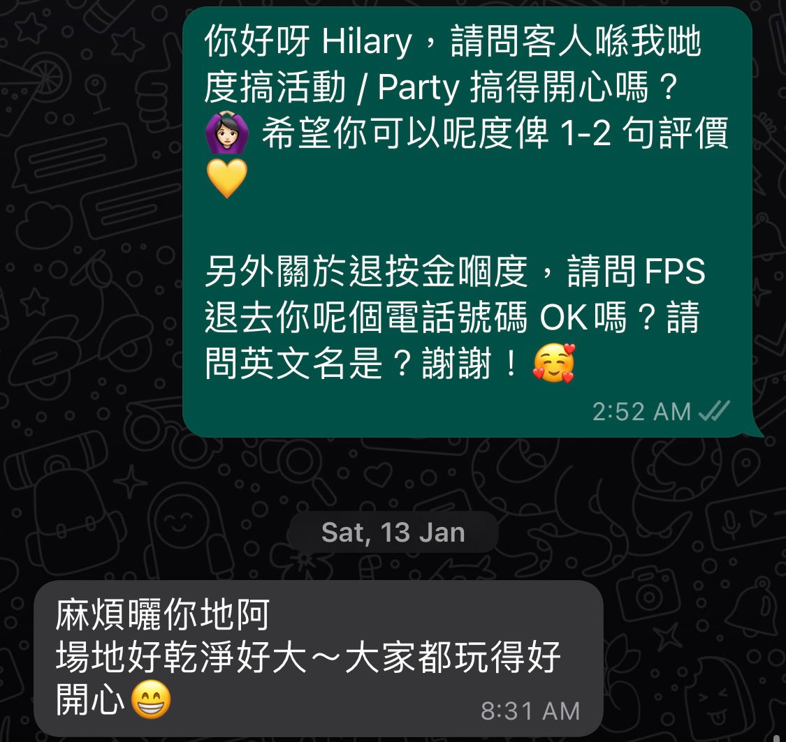 預訂方式- 在查詢核對預約細節並確認可提供場地後,客人須支付全額的一半(50%)作為訂金以確認預約